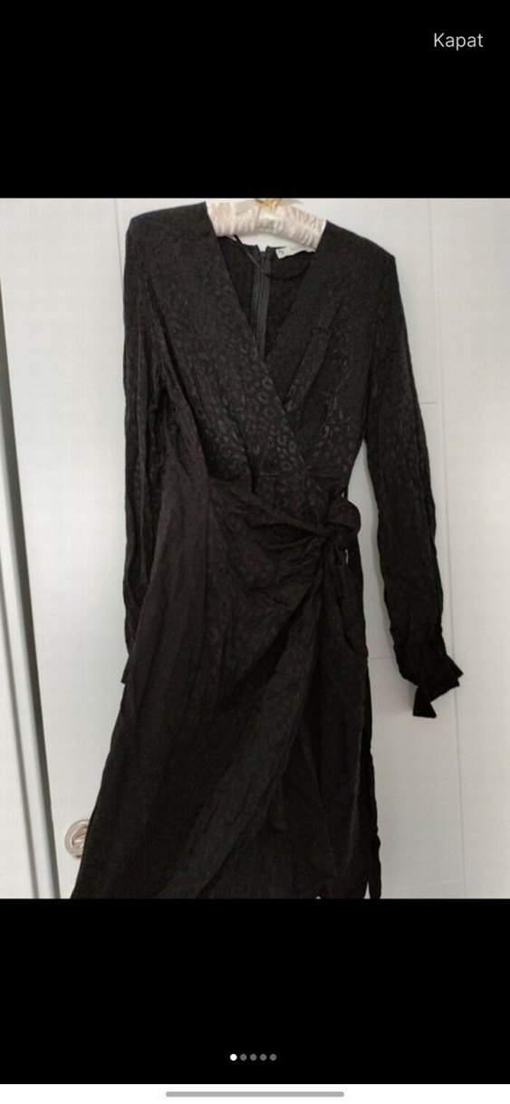 Bu siyah uzun elbise, desenli ipeksi kumaş ve drapeli detaylara sahiptir. V yaka ve uzun kolludur.