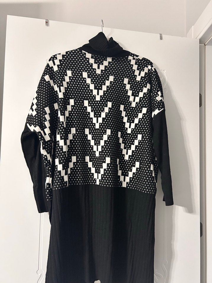 Desenli üst kısmı ve balıkçı yakası olan siyah uzun örme triko elbise, bol kesim ve uzun kollu. Günlük kullanım için çağdaş avangart tarzda.