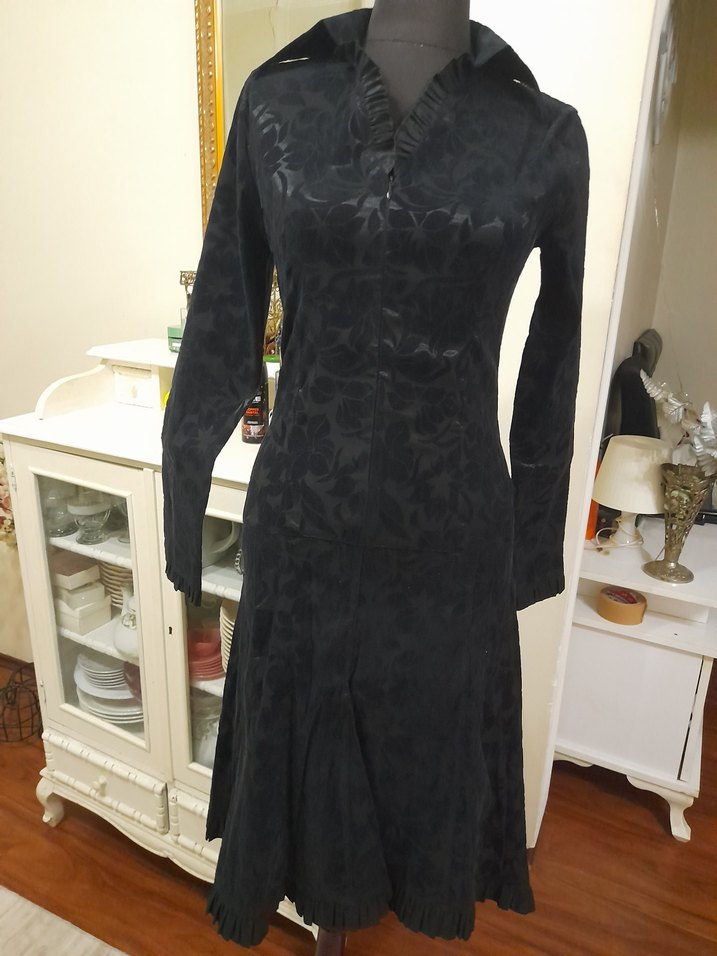 Siyah hafif parlak tafta gibi esnek üzeri süet desenli kumaştan, yakalı ve uzun kollu, drapeli yakadan bele kadar önden fermuarlı yaka kol ve etek ucu şık fırfır detaylı uzun elbise, ofis gece günlük dügün nişan kullanımı için uygun.(Gögüs 40 bel 36 basen 42 boy 110 sıfır etiketli şık kaliteli üründür elimde aynı model ve renk 3 tane 38 2 tane 36 beden mevcut