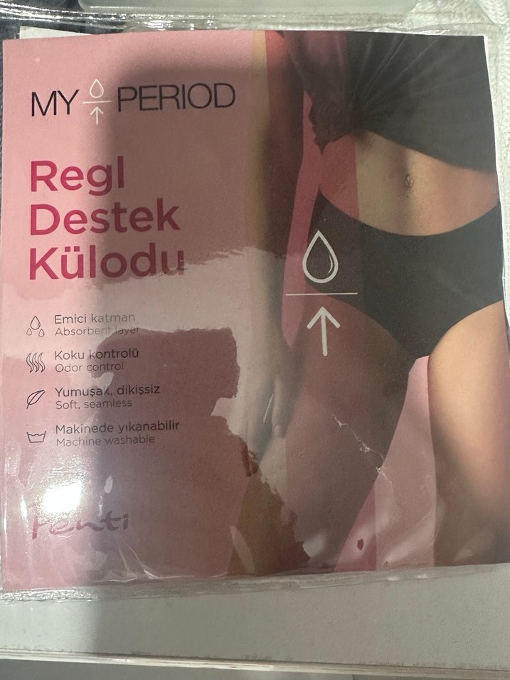 Siyah, baskılı, destekli regl külot. Emici katman, koku kontrolü ve yumuşak, dikişsiz kumaşa sahip. Makinede yıkanabilir.