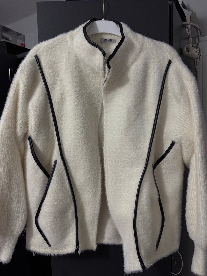 Beyaz peluş kumaştan, kürk detaylı, siyah şeritli, notched yakalı, uzun kollu, bol ve kısa kesim kadın ceketi. Sokak stili için uygundur.