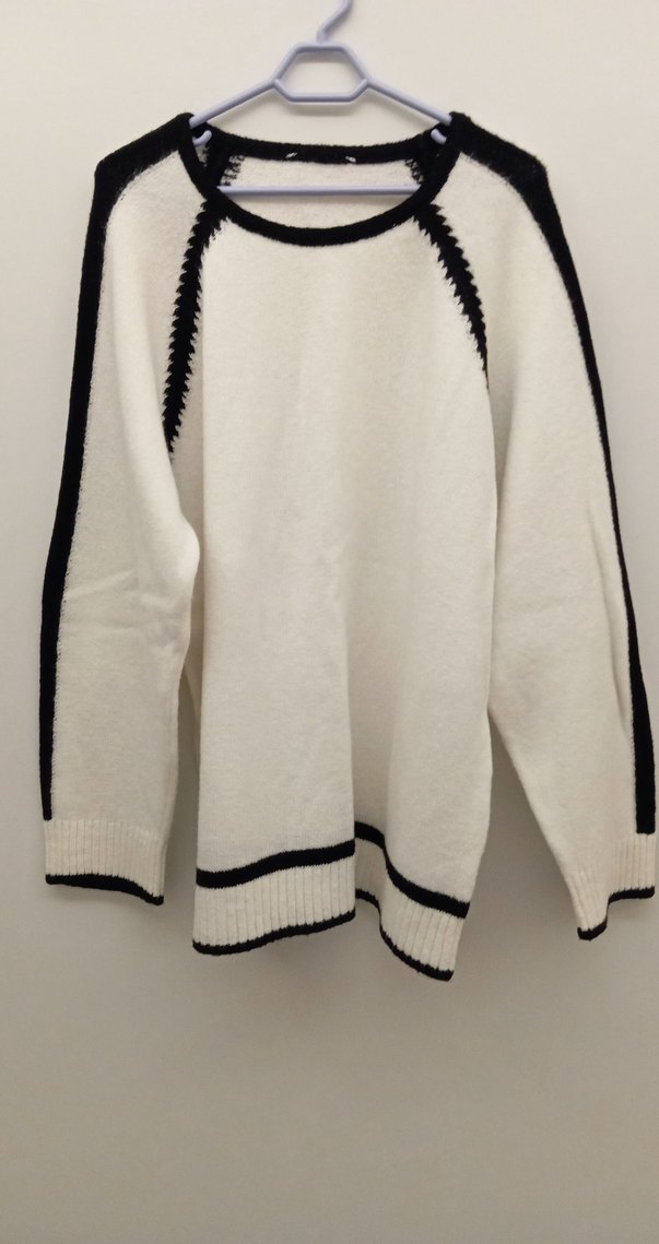 Siyah detaylı beyaz triko kazak, uzun kollu ve bisiklet yaka, rahat ve bol kesim sunar.