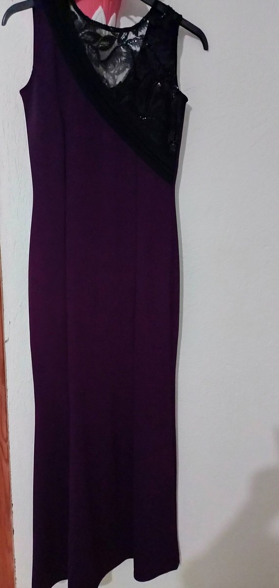 Koyu mor renkte, yumuşak sentetik kumaştan yapılmış, drapeli ve V yakalı, kolsuz, vücuda oturan uzun elbise. Minimalist gotik tarzıyla romantik akşamlar için uygun.