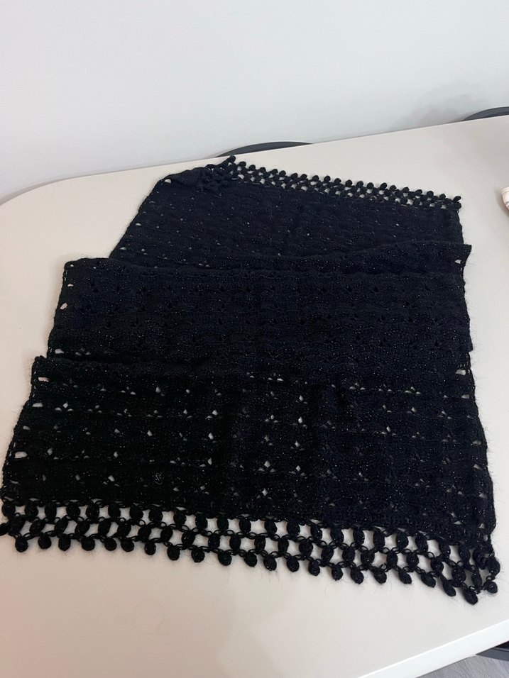 Siyah renkte, dantel detaylı örgü kadın şal. El örgüsü çeyizlik büyük dikdörtgen şal