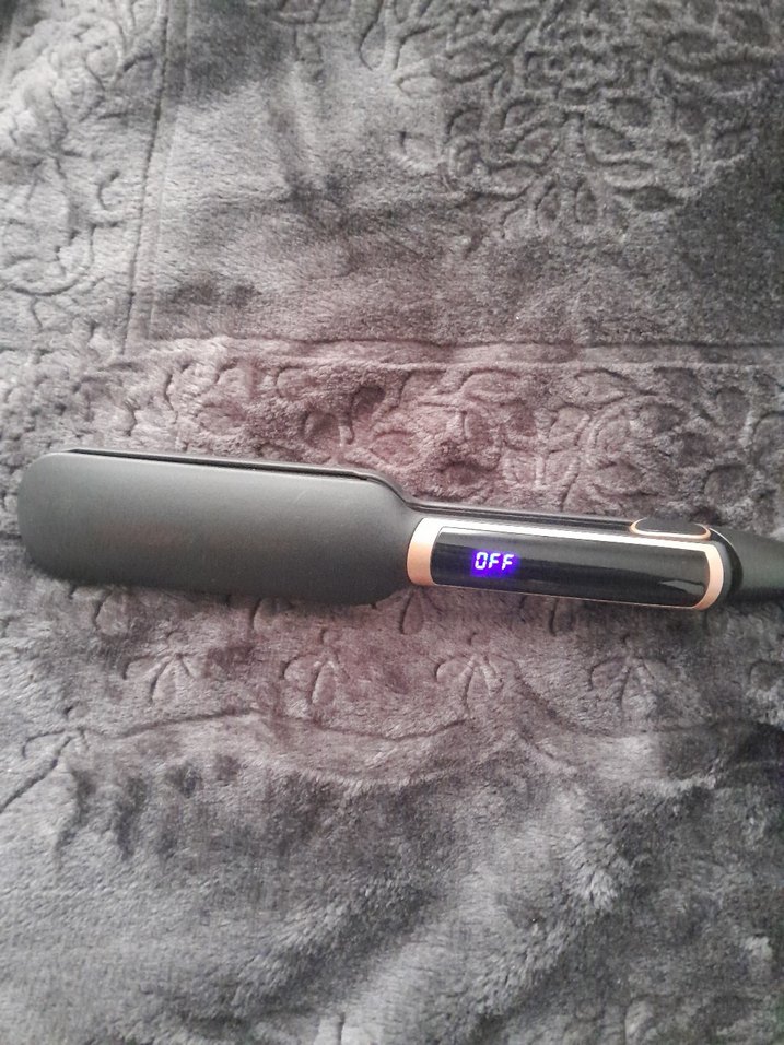Siyah saç düzleştirici, güç durumunu gösteren dijital ekrana sahiptir. Koyu renkte şık tasarımlıdır. ✨