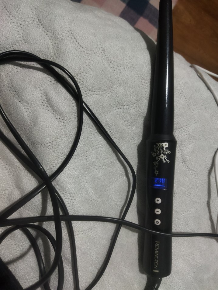 Dijital ekran ve kontrol düğmelerine sahip siyah saç maşası. Uzun, konik variliyle farklı şekillerde bukleler oluşturur.