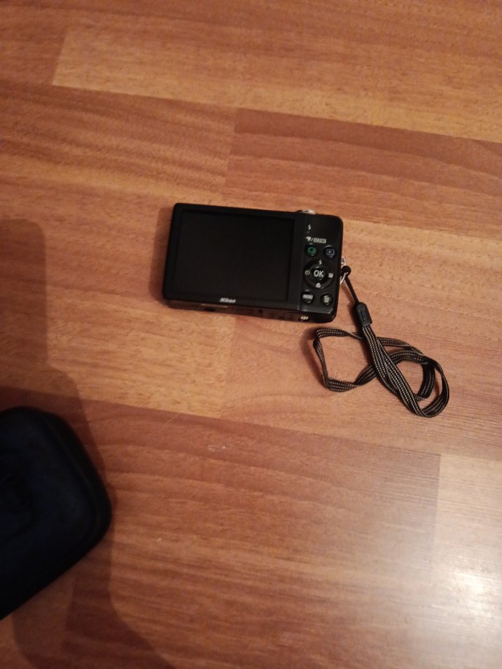 Büyük ekranlı ve bilek kayışlı siyah kompakt dijital kamera.