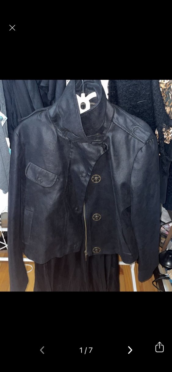 Siyah deri, düğmeli, uzun kollu, normal boy, kesimi vücuda oturan kadın ceketi. Günlük sokak stili için uygundur.