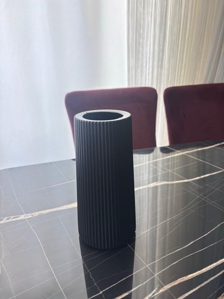 Bu siyah vazo, dikey çizgili dokusuyla modern ve şık bir görünüm sunar. Koyu rengiyle her mekâna zarafet katar. Plastik