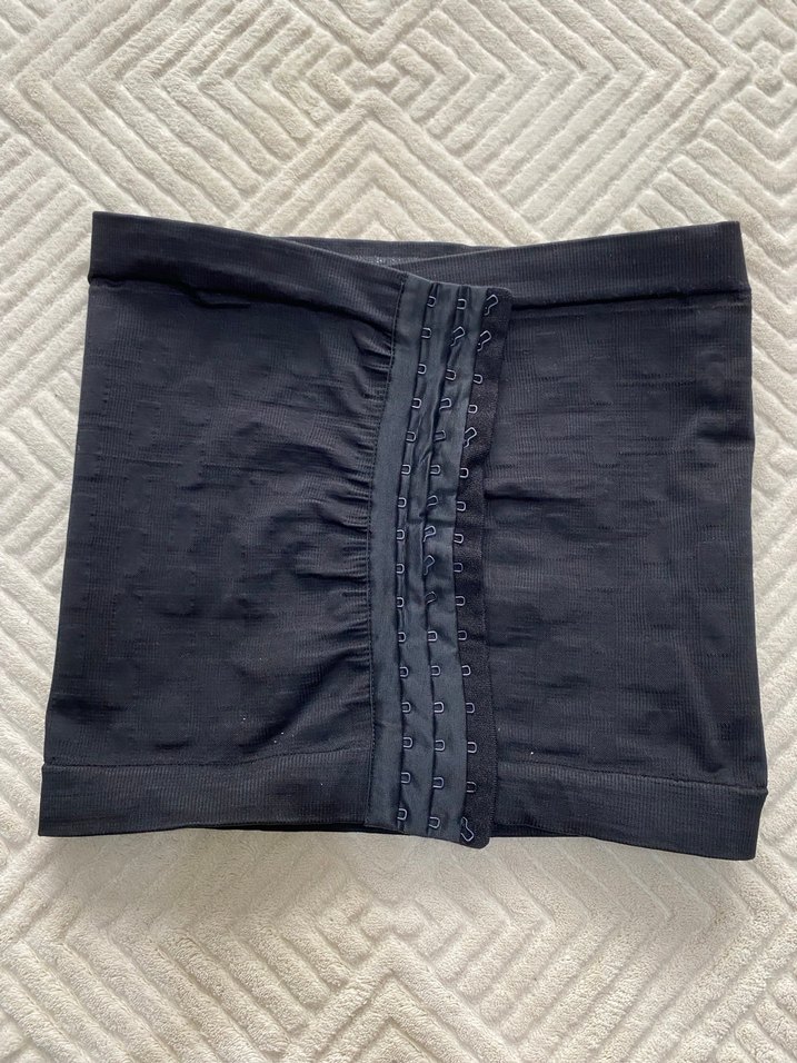 Önünde kanca kapama bulunan, dikişsiz tasarıma sahip, midi uzunlukta siyah, vücuda oturan aşırı sıkıp rahatsız etmeyen korse