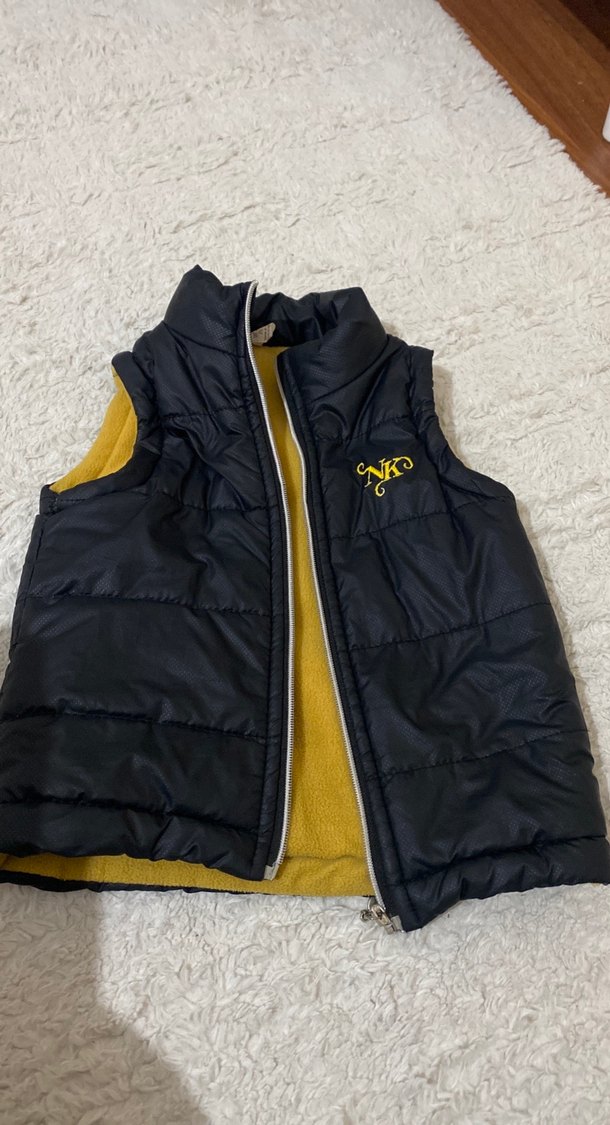 Yüksek yakalı, fitted kesim, sarı yumuşak astarlı ve siyah dış yüzeyli, kürk detaylı erkek yeleği. Rahat sokak tarzı için uygundur.