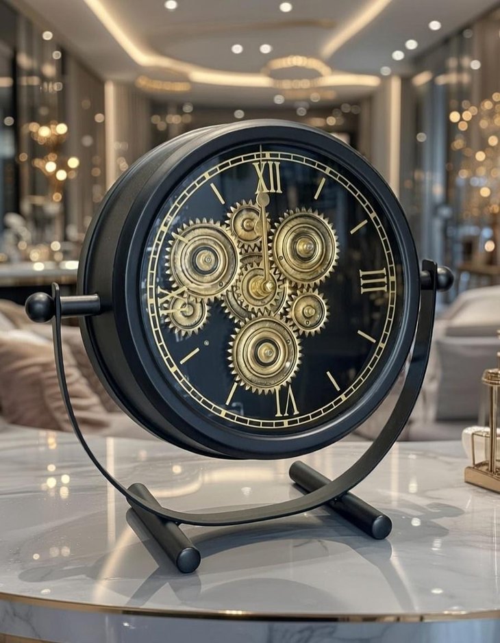 Altın dişli mekanizmalı ve Roma rakamlı kadranlı siyah masa saati, yuvarlak çerçeveli ve ayaklıdır. ️