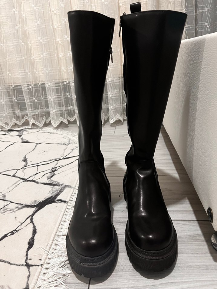 Parlak lastik malzemeden yapılmış siyah diz boyu çizme. Önünde bi büyükülme var aldığımda da böyleydi ayakta o kadar belli olmuyor son fotoğrafta belirttim .fiyatını ona göre yazdım 2 kez giyildi sadece
