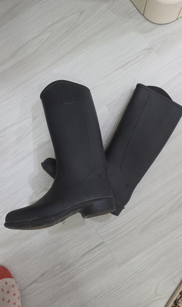 Siyah diz üstü lastik çizmeler, ince topuklu ve tokalı, sade gotik tarzda tasarlanmıştır.
