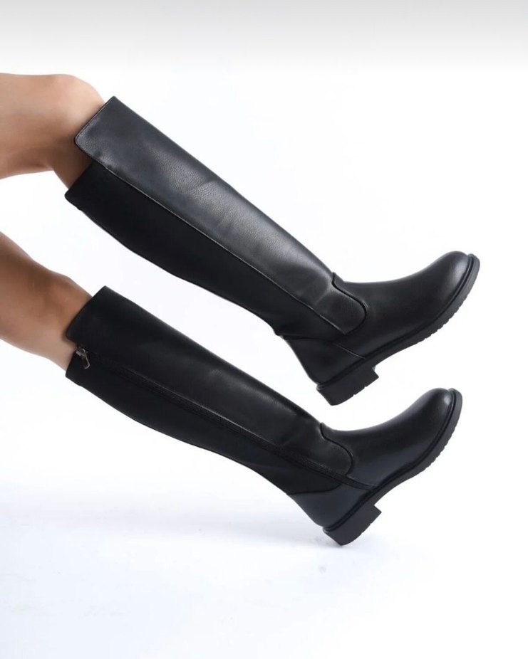 Siyah dizüstü çizme, kalın topuklu, kauçuk malzemeden üretilmiştir. Günlük kullanıma uygun, minimalist ve çağdaş tasarım