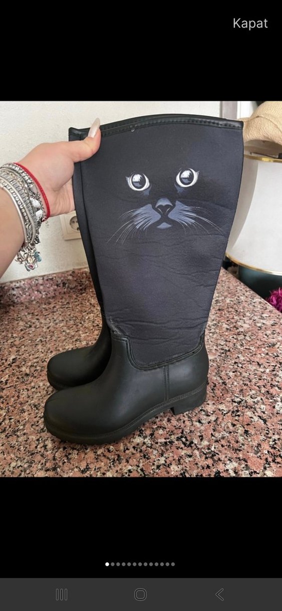 Siyah dizüstü, kürk detaylı, topuklu kadın çizmesi. Kauçuk malzemeden yapılmış, kedi yüzü desenli, trend bir günlük stil için uygun.