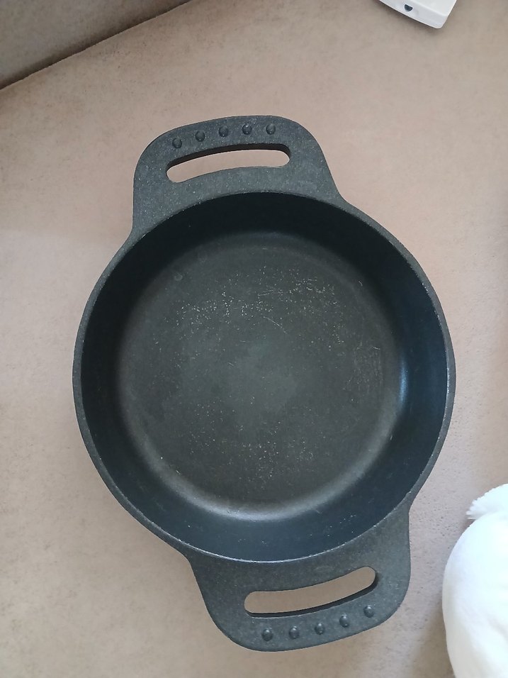 İki saplı siyah döküm tencere, dayanıklı yüzeyiyle çeşitli yemekler için uygundur.