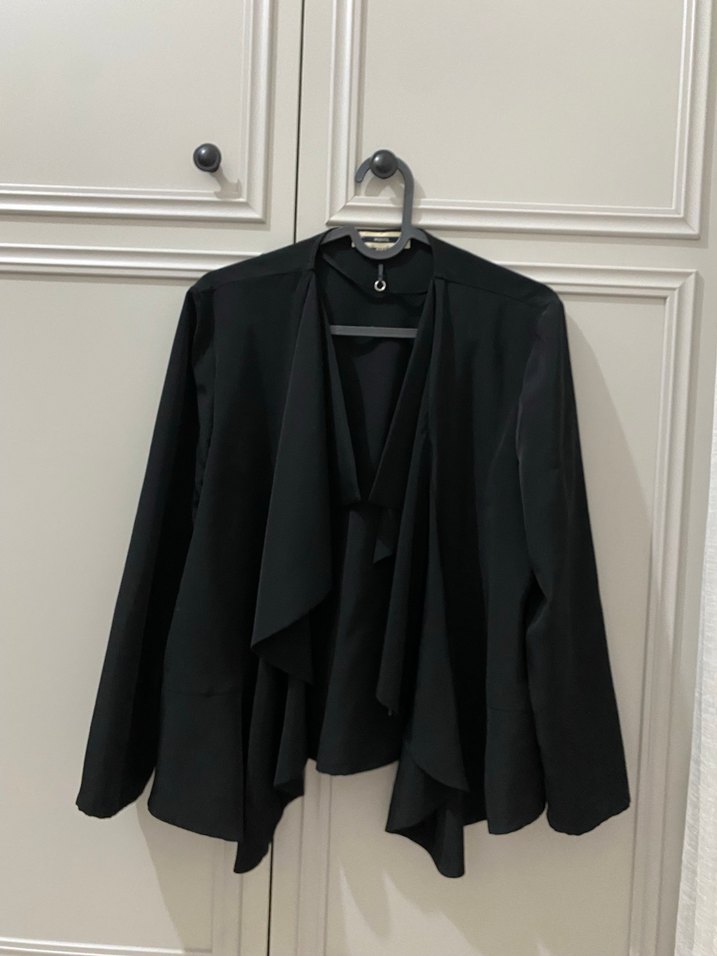 Siyah, dökümlü uzun kollu ve dar kesimdir. Ofis için şık ve ipeksi dokulu. Kısadır, kalçaya gelmez. Kuşağı kayıp. Bir kusuru yoktur. 40 beden yazıyor fakat 38 bedene daha iyi olur.