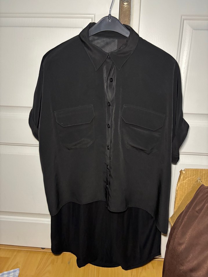 Dökümlü kesim, düğmeli siyah midi gömlek. Kısa kollu ve yakalı, ipeksi kumaştan. Ofis için gotik tarzda uygun. Önü saten arkası pamuklu. Önü kısa arkası uzun. Marka temsili. M-L bedene uygun