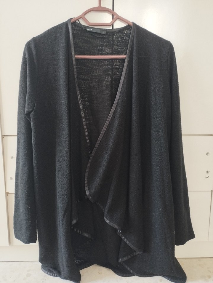 Siyah renkli, keten kumaştan uzun kollu, dökümlü ve bol kesim kadın hırka. Notched lapel yaka ve günlük kullanıma uygun normcore tarzı.