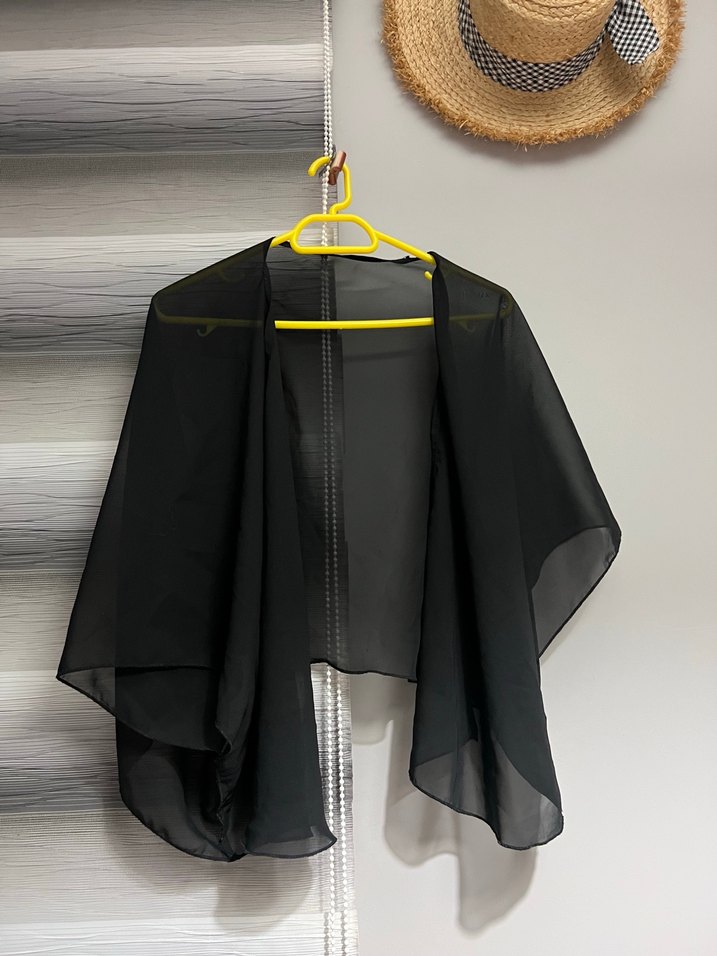 Siyah dökümlü kadın şal, hafif sentetik kumaştan yapılmıştır ve minimalist gotik tarzıyla karanlık, zarif bir görünüm sunar.