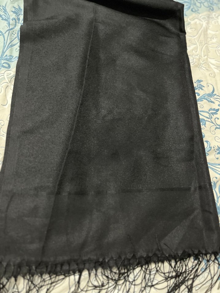 Siyah, ipeksi dokulu kadın şal, dökümlü tasarımı ve ince püskülleriyle gotik ve avangart tarzlar için uygundur.
