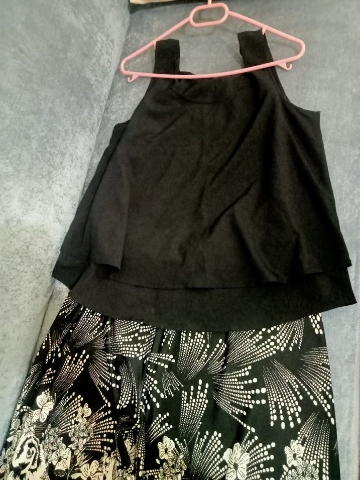 Siyah renkte, dökümlü detaylara sahip, yumuşak sentetik kumaştan üretilmiş, bol kesim mini hamile Takım Günlük kullanım için uygundur.