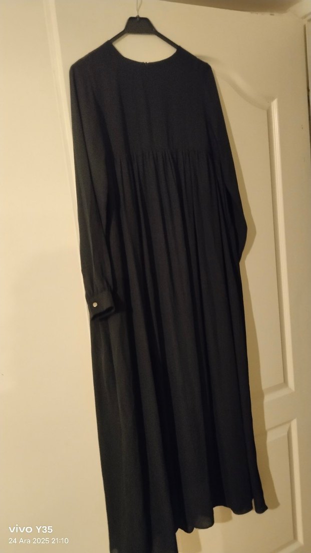 Siyah uzun viskon elbise, yuvarlak yakalı ve uzun kollu, dökümlü arka yakası ve kolu dügme detaylı bol kesimle mütevazi ve sade bir görünüm sunar.hamile bayanlar için de çok elverişlidir. elbise hiç kullanılmadı sadece etiketi çıkarıldı