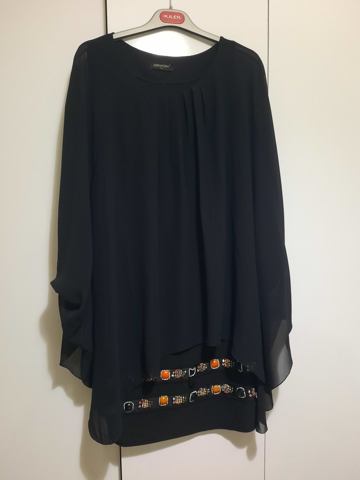 Siyah,şifon kollu, dökümlü midi tunik. Yumuşak sentetik kumaştan, yuvarlak yaka ve etek kısmında süslemelerle.