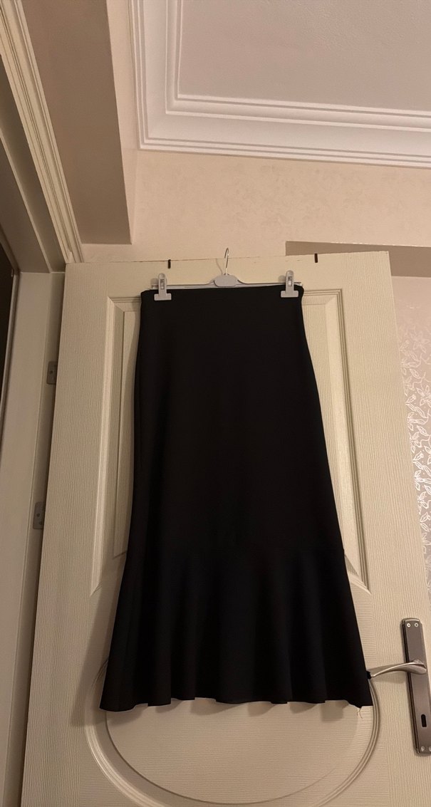 Dökümlü tasarıma sahip, siyah uzun ve vücuda oturan kadın eteği, yumuşak sentetik kumaştan üretilmiştir, minimalist gotik stile uygundur.