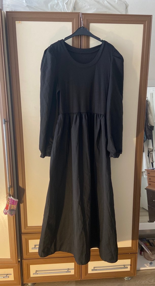 Siyah uzun keten elbise, dökümlü ve bol kesimdir. Bisiklet yaka ve uzun kolludur, minimal goth tarzını yansıtır. Günlük kullanıma uygundur.