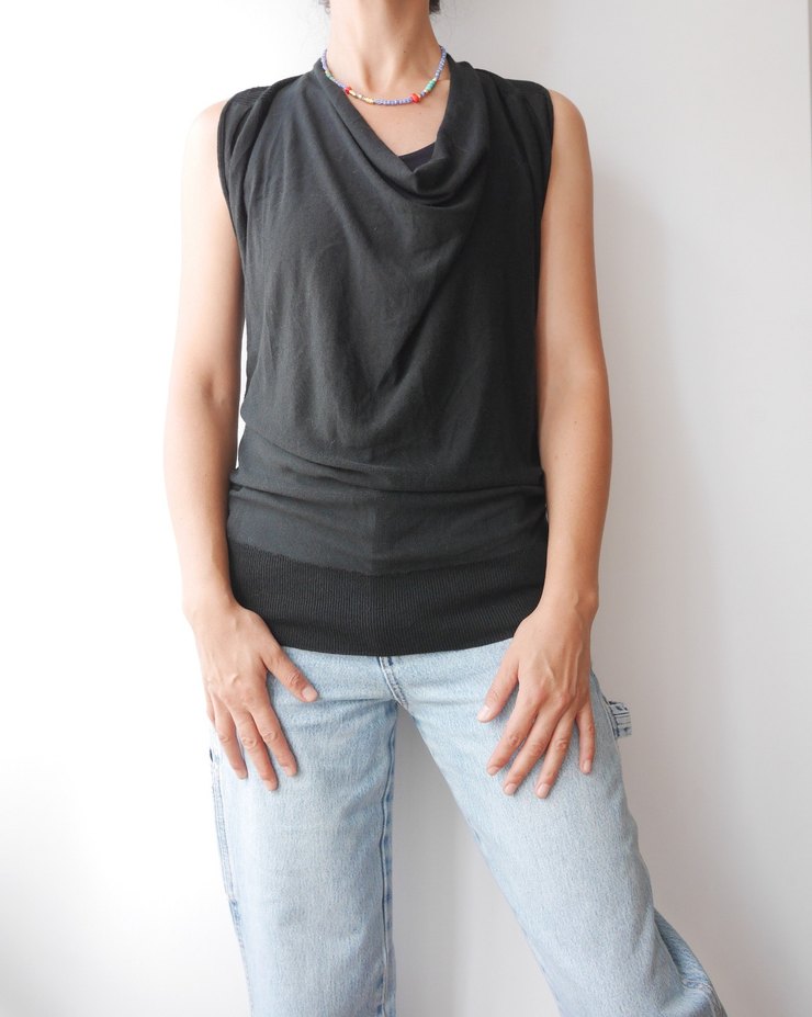 Siyah,Dökümlü Yakalı Kolsuz Triko Bluz