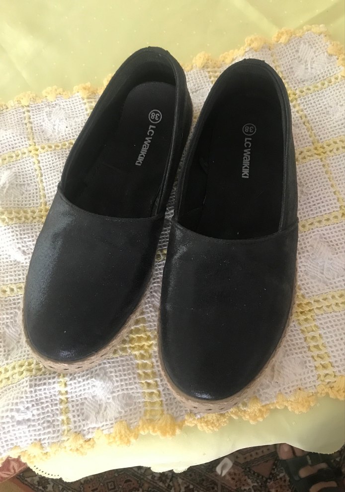 Siyah, parlak yüzeyli, dolgu topuklu kadın espadril ayakkabı, sade ve desensiz tasarımıyla günlük kullanım için uygundur.