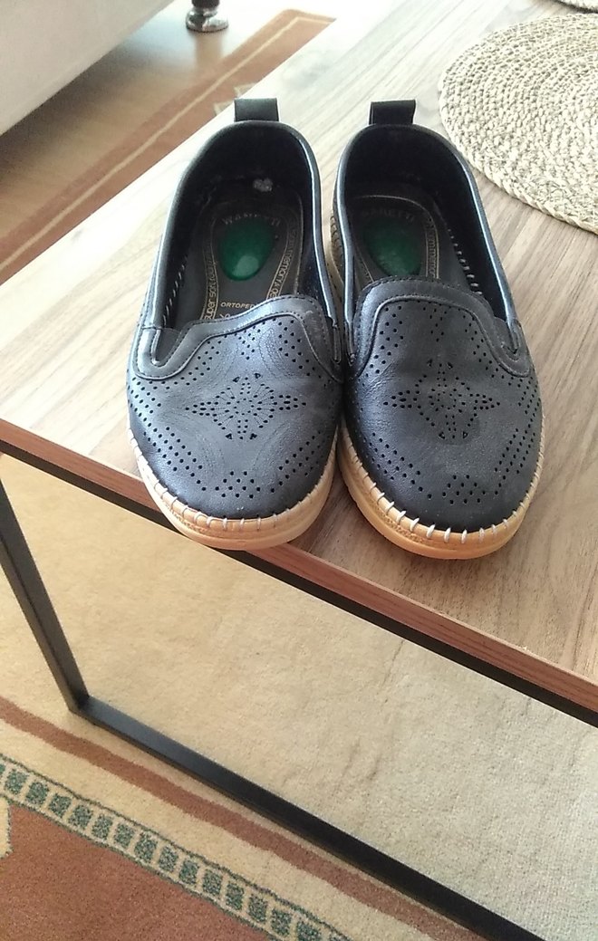 Siyah dolgu topuklu kadın espadriller, minimal delikli desen ve tokalı tasarımla günlük rahat kullanım için uygundur.