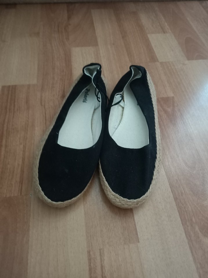 Siyah dolgu topuklu espadriller, kauçuk tabanlı ve minimalist tasarımlı, zahmetsiz şıklık ve günlük kullanım için uygun. Rahat ve şık.