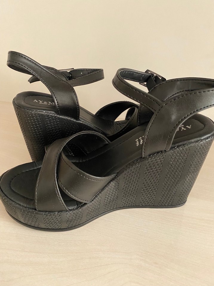 Siyah tokalı bantlara sahip dolgu topuklu kadın sandalet, Deformesi Yoktur 38 Numaradır.