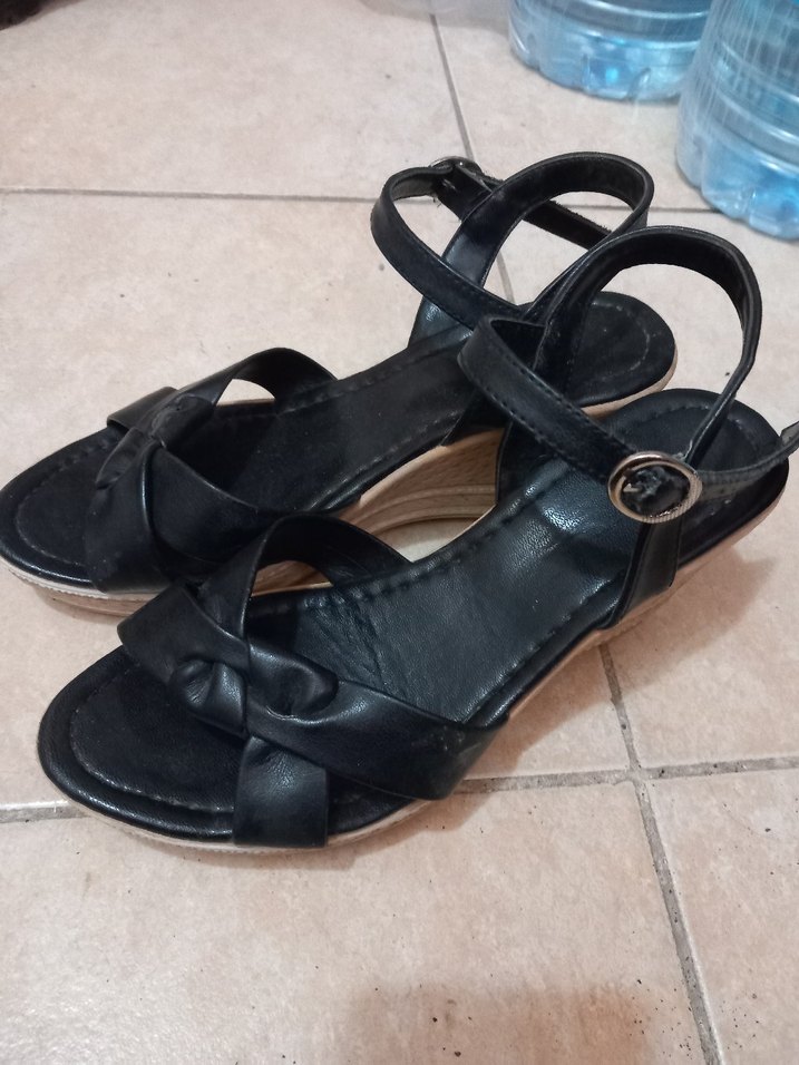 Siyah dolgu topuklu sandaletler, tokalı kayış ve sade minimalist tasarıma sahiptir. Kauçuk malzemeden yapılmış, günlük kullanım için uygundur.