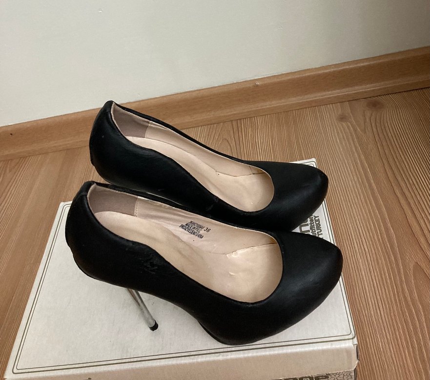 Siyah dolgu topuklu, kauçuk malzemeden yapılmış, ofis kullanımı için uygun, klasik goth tarzında ve zahmetsiz şıklık sunan stiletto.