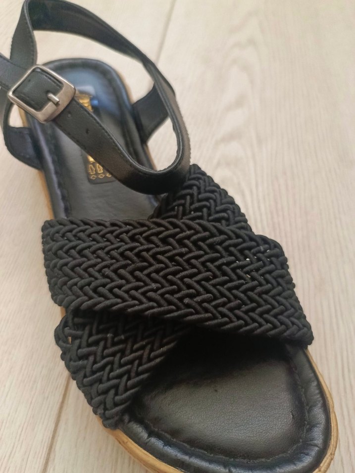 Siyah dolgu topuklu kadın sandalet, örgü detaylı ve tokalı bilek kayışıyla. Yılan desenli hafif dokusu ve rahat kauçuk tabanı bulunur.