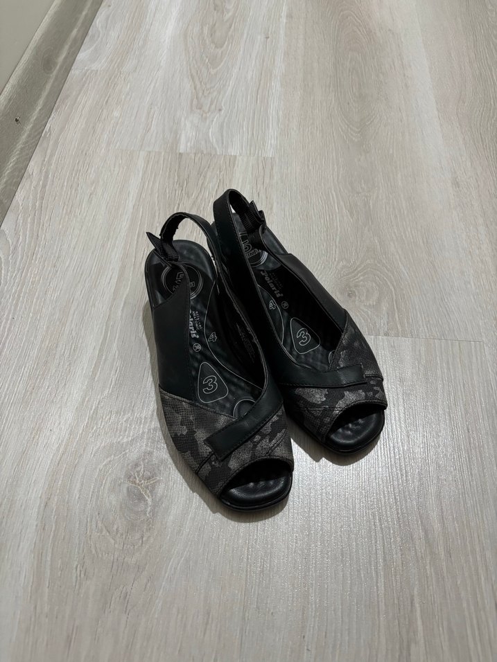 Yılan desenli siyah dolgu topuklu sandaletler, tokalı ve kauçuk malzemeden, gotik tarzda şık bir görünüm sunar.