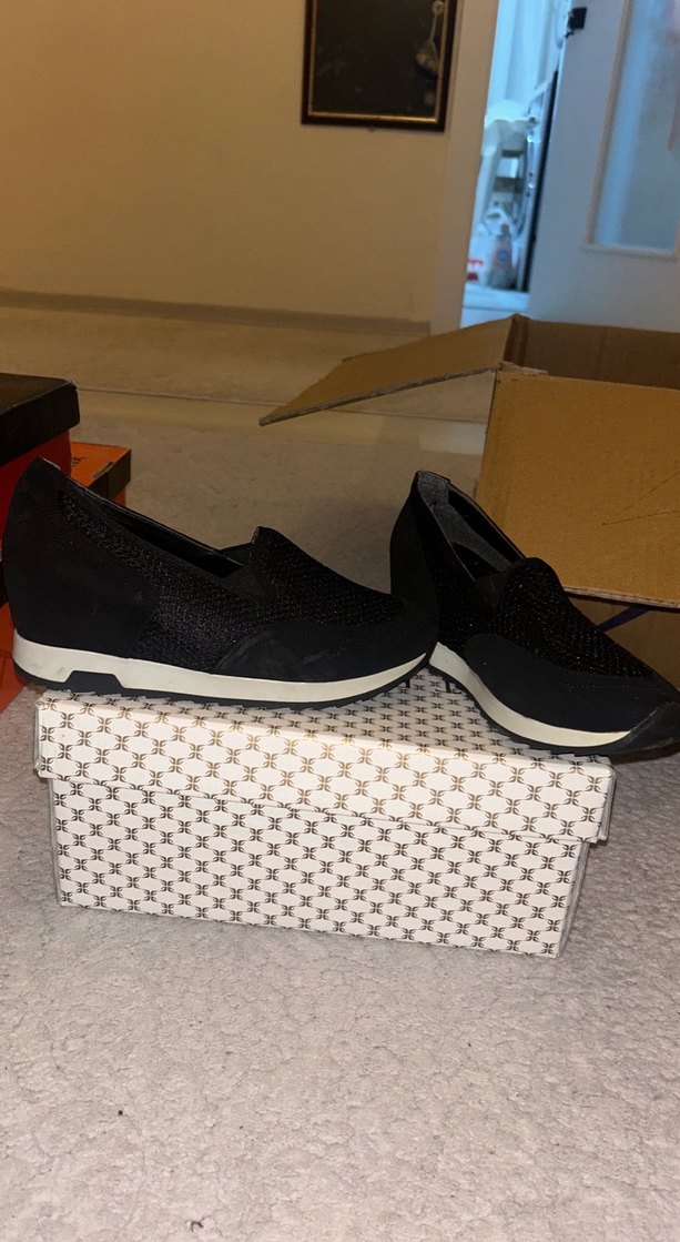 Siyah ydolgu topuklu spor ayakkabı,kauçuk tabanlı, günlük sokak stili için uygun. Okadar rahat ve şık ki ben numarasını küçük almışım iade süresini de kaçırdığım için elimde kaldı hiç kullanılmadı.hemenhemen 5 cm içerden topuğu var