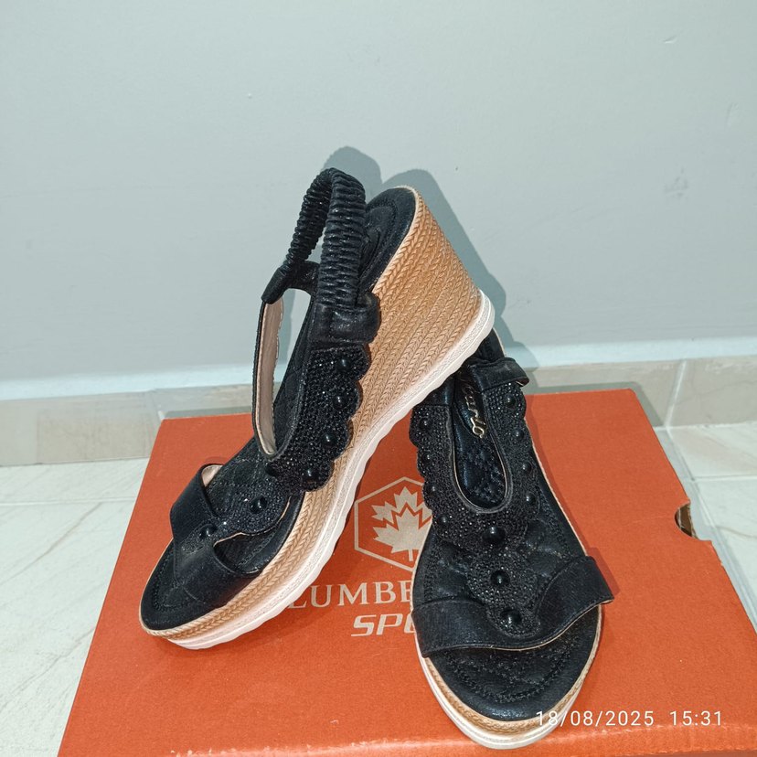 Siyah dolgu topuklu kadın sandalet, yılan deseni, kauçuk malzeme ve tokalı bantlarla. Günlük sokak stili için uygundur.