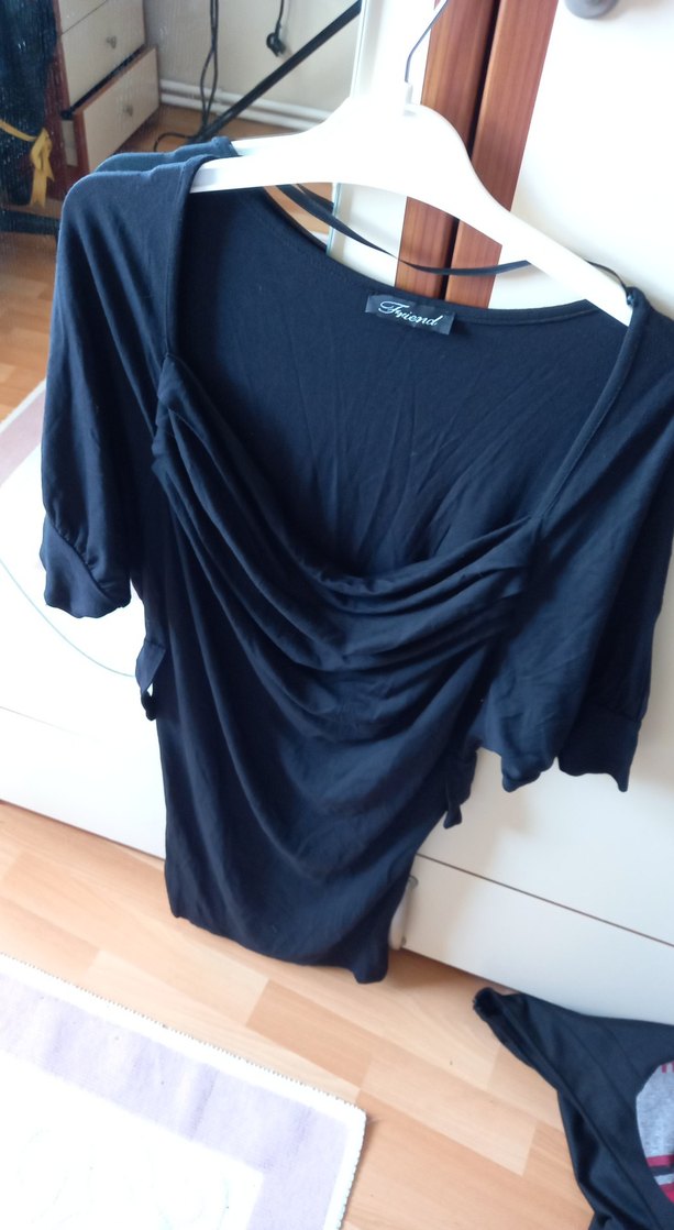 Siyah keten hamile gömleği, drape detaylı, kısa kollu ve kayık yaka. Salaş kesim ve midi boyda, günlük rahat kullanıma uygun.