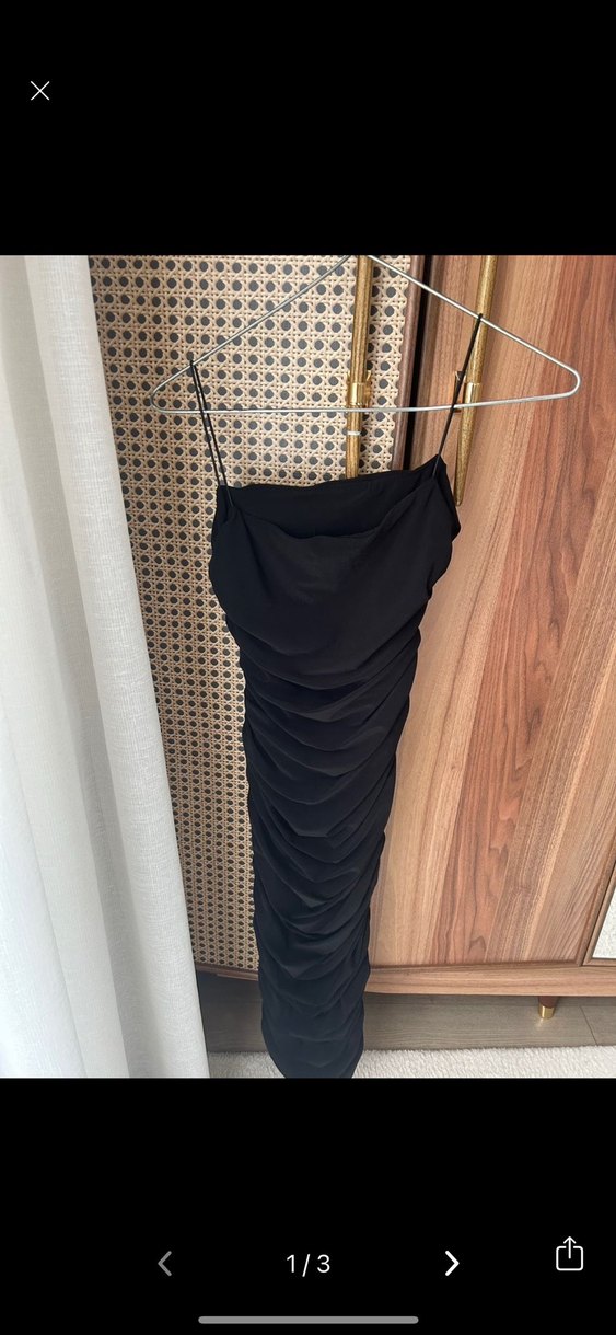 Drapeli ve askılı, straplez yaka detaylı siyah uzun abiye elbise. İnce ve vücuda oturan kesimiyle romantik akşamlar için ideal.