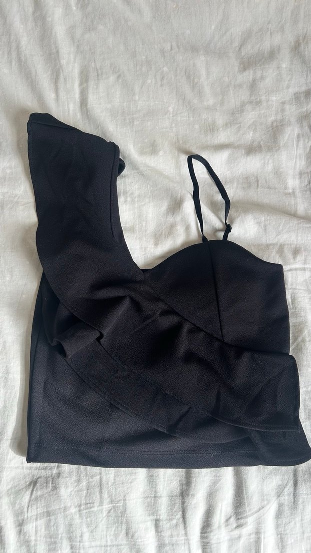 Siyah crop top, askılı ve straplez yakasıyla fit kesime sahiptir. Drapeli tasarım ve yumuşak sentetik kumaştan yapılmıştır, günlük kullanım için uygundur.