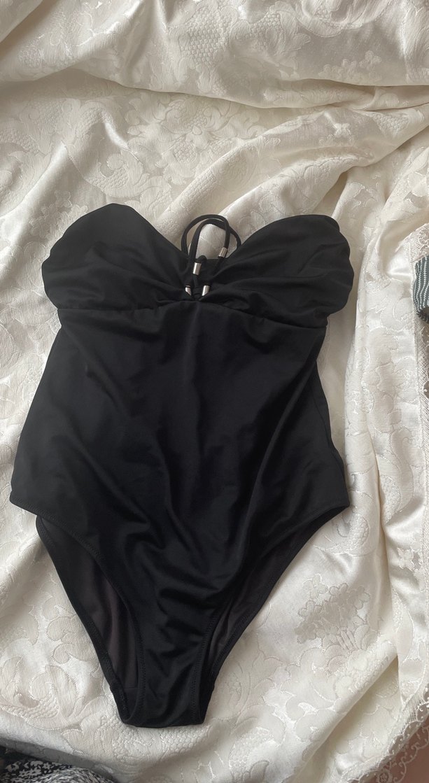 Siyah, askılı ve drapeli detaylara sahip, oturan kesim kadın mayo. Goth esintili athleisure tarzıyla plajda kullanıma uygun.