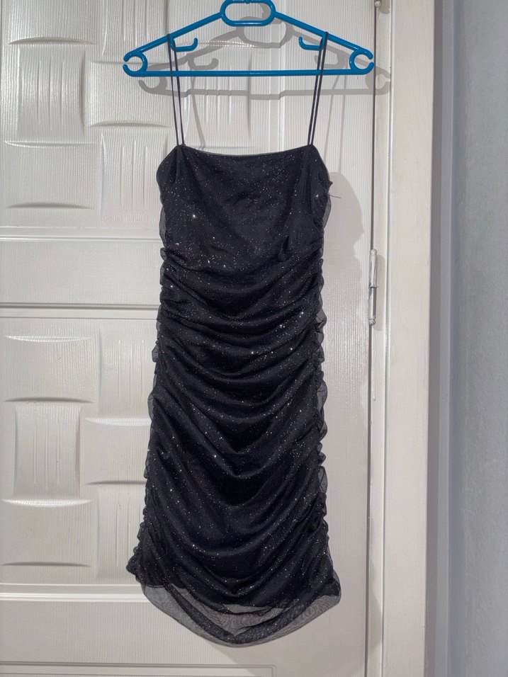 Siyah, drapeli ve askılı, straplez yaka detaylı, vücuda oturan midi elbise. Yılbaşı parti için uygun. ✨