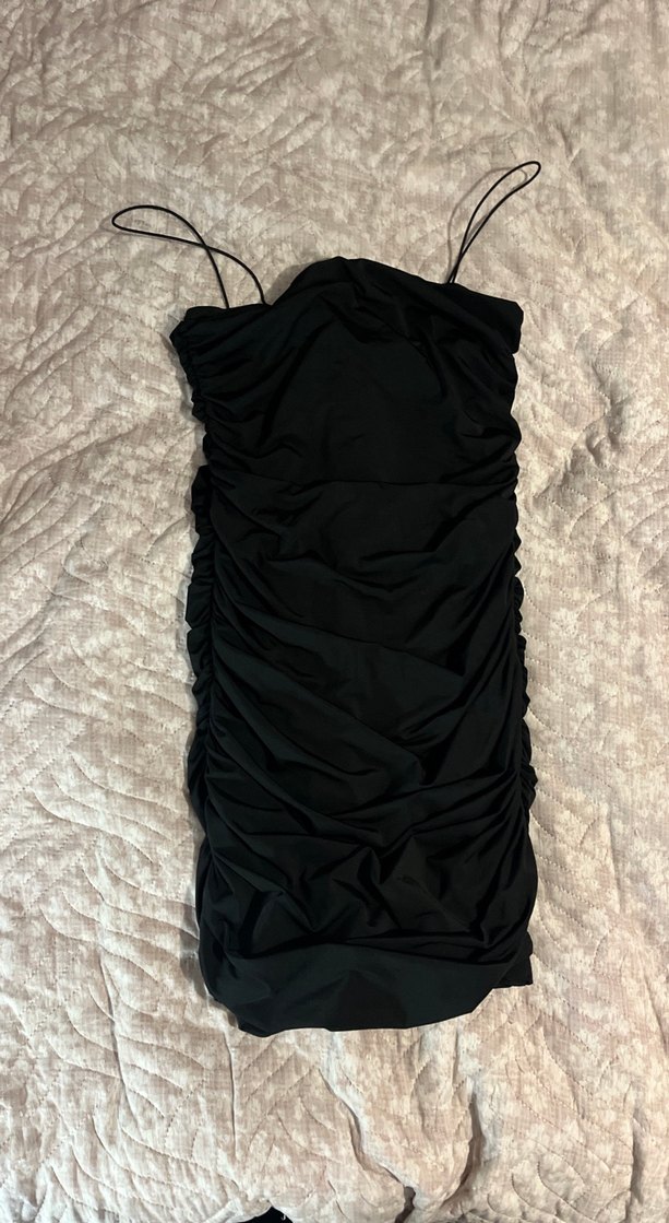 Siyah, drapeli, ince askılı ve mini elbise. Hiç giymedim.