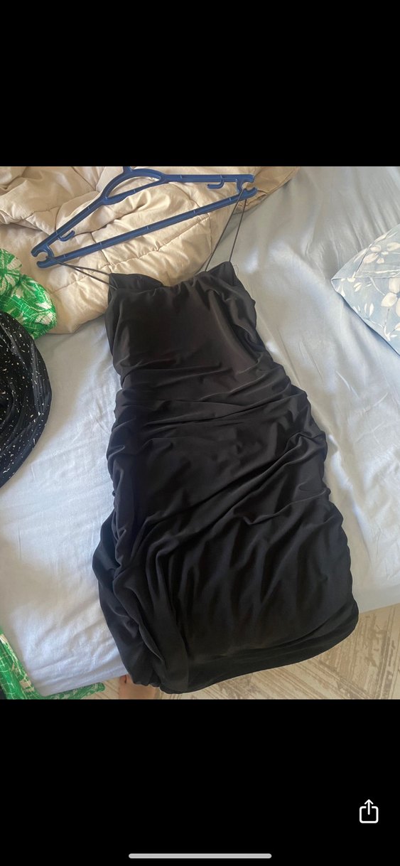 Siyah, drapeli ve askılı, straplez yakalı uzun boy kadın elbisesi. Fitted kesimi ve minimalist tarzıyla romantik akşamlar için uygundur.