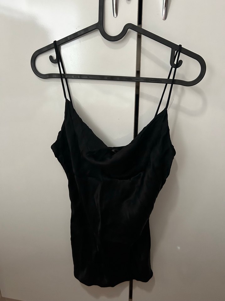 Siyah, ince askılı, v yaka ve drapeli tasarıma sahip, saten dokulu, vücuda oturan kadın atlet. Minimalist gotik tarzda, günlük kullanıma uygun.